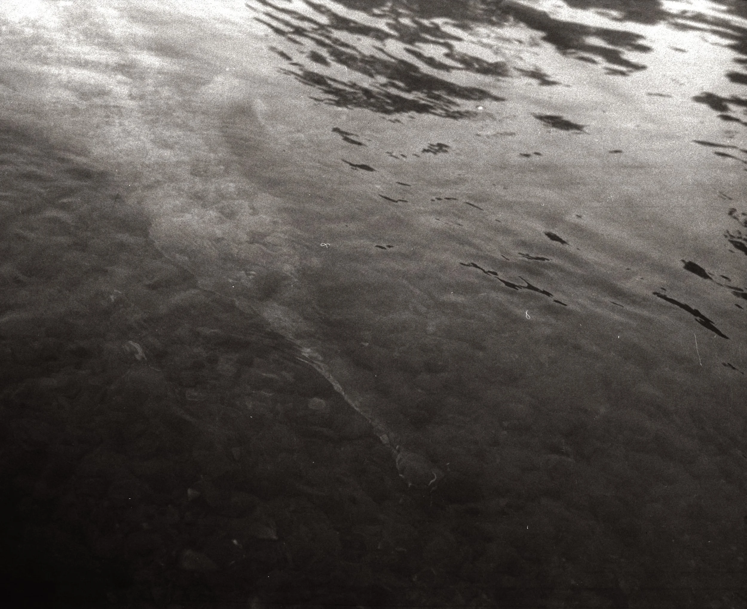 My first roll was Kodak Gold 200. The light readings were low. With the moving of the canoe and the length of my lens, most of the images I suspected would be blurred until I could increase my shutter. I clicked off a few shots anyway. A lone man stands in his canoe with his long pole, a single grey green shape in the cloud. I waited a long time framing to decide what shape would read best. We drew closer and closer as I pulled my focus. My Kodak Gold was processed extremely dirty with many chemical artifacts but the mood did remain.