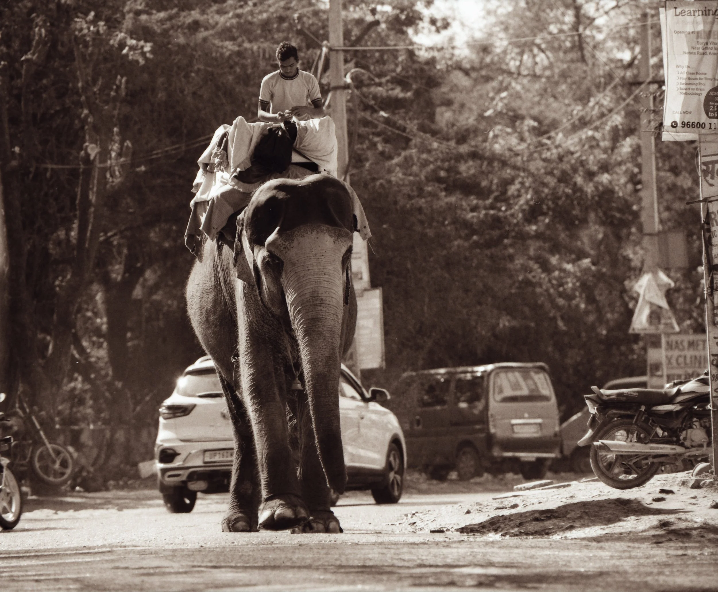 While grateful for the experience I was not pleased by the handling of the reserve with the jeeps. I also felt a sense of guilt and feeling a bit like an imposter as I rode along with so many other tourists and "safari goers". Curious if this was going to be the case everywhere, I continued traveling west into a region called Rajasthan. Jumping around different cities, I explored their markets and their many aged forts. It was common in these areas to see elephants mounted with large baskets for people to ride inside and camels strapped with large baskets of goods. For several weeks I moved through these cities, shooting, my negatives starting to stack up. I needed to return to New Delhi to drop off some rolls to be developed, and so I did. Having already spent several days in Delhi earlier in my trip I dropped my film off at the lab and continued on further eastward.
